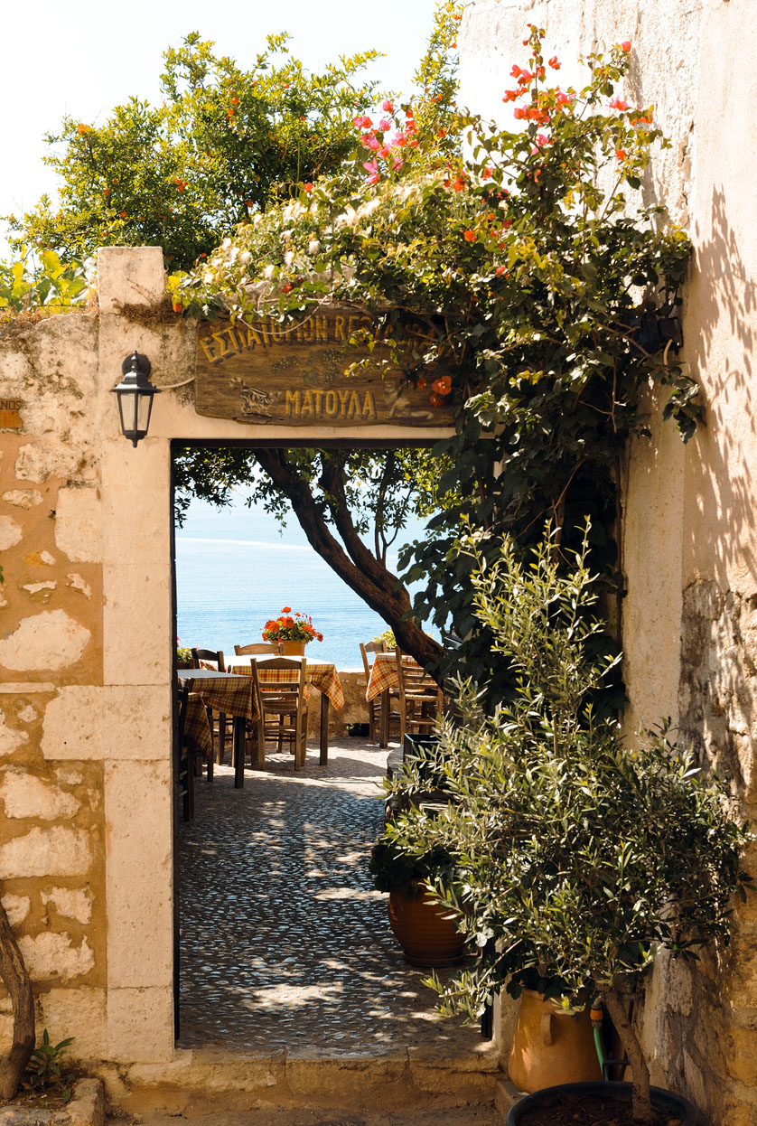 Monemvasía es una localidad fortificada situada en un enorme promontorio- una pequeña península- que fue utilizada como refugio por los griegos del imperio bizantino que huían de las invasiones de los pueblos eslavos. Un puente es el único punto de unión con la costa laconiana, de ahí su nombre móni- (‘sola, única’)y émvasís (‘entrada’). Su estructura original se ha conservado en perfecto estado, con sus casitas de piedra, las encantadoras (y empinadas) callejuelas empedradas con arcos, hasta 40 iglesias bizantinas, caracterizadas por sus cúpulas redondas y las murallas venecianas de la ciudadela.