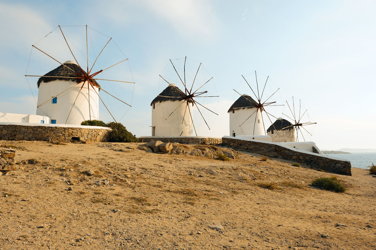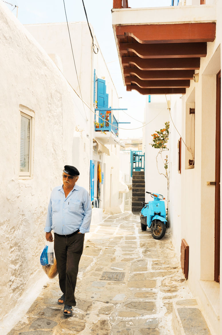 A diferencia del resto de islas Cícladas, Mikonos es bastante llana, por lo que para protegerse de los asedios de piratas como Barbarroja, a los que estuvo sometida durante años, sus calles fueron diseñadas con una estructura similar a un laberinto, para que los lugareños pudieran esconderse fácilmente en caso de ataque. Por eso es el lugar perfecto para perderse –literalmente–. Las características iglesias de cúpulas pintadas de añil (más de 400 en toda la isla), las callejuelas de casas encaladas con puertas y ventanas de colores vivos y las flores que decoran los balcones representan la estampa perfecta de las Cícladas. Si te desvías un poco de las arterias más concurridas –en las que proliferan las tiendas de ropa y artesanía, bares, heladerías, galerías de arte– te encontrarás paseando por calles prácticamente desiertas, a excepción de algún pescador jubilado saboreando un pitillo o alguna anciana asomada al balcón de su casa.