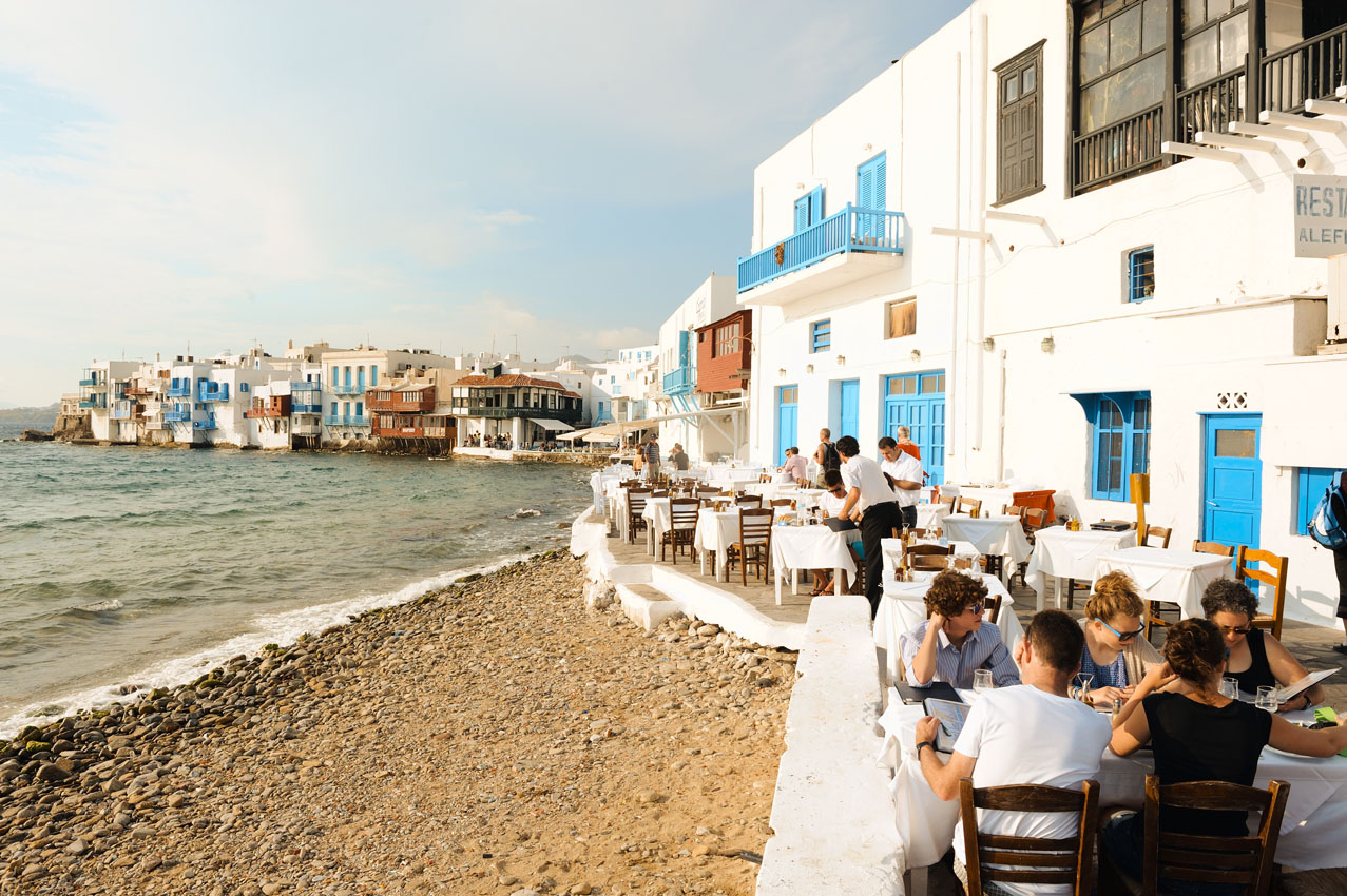 En el bartrio de Alefkándra la vida discurre con calma, como si ignorara que Mikonos se ha convertido en uno de los destinos turísticos más famosos del mundo desde que en los años 60 Jackie Onassis quedara cautivada por la isla. La mujer del armador griego supo valorar sus magníficas playas, sus icónicos molinos de viento y su pintoresco barrio de Alefkándra, más conocido como la ‘Pequeña Venecia’. Este nombre se le dio gracias a las casas construidas en primera línea de mar, con balcones y pórticos suspendidos sobre el agua, que crean la ilusión de estar ante un canal veneciano. Hoy, estos edificios alojan originales restaurantes y bares de copas donde, al caer la tarde, la gente guapa va a cenar para coger fuerzas y hacer frente a la larga noche de fiesta que les espera. Porque si por algo es conocida Mikonos es por la marcha nocturna.