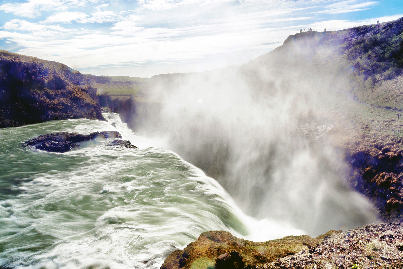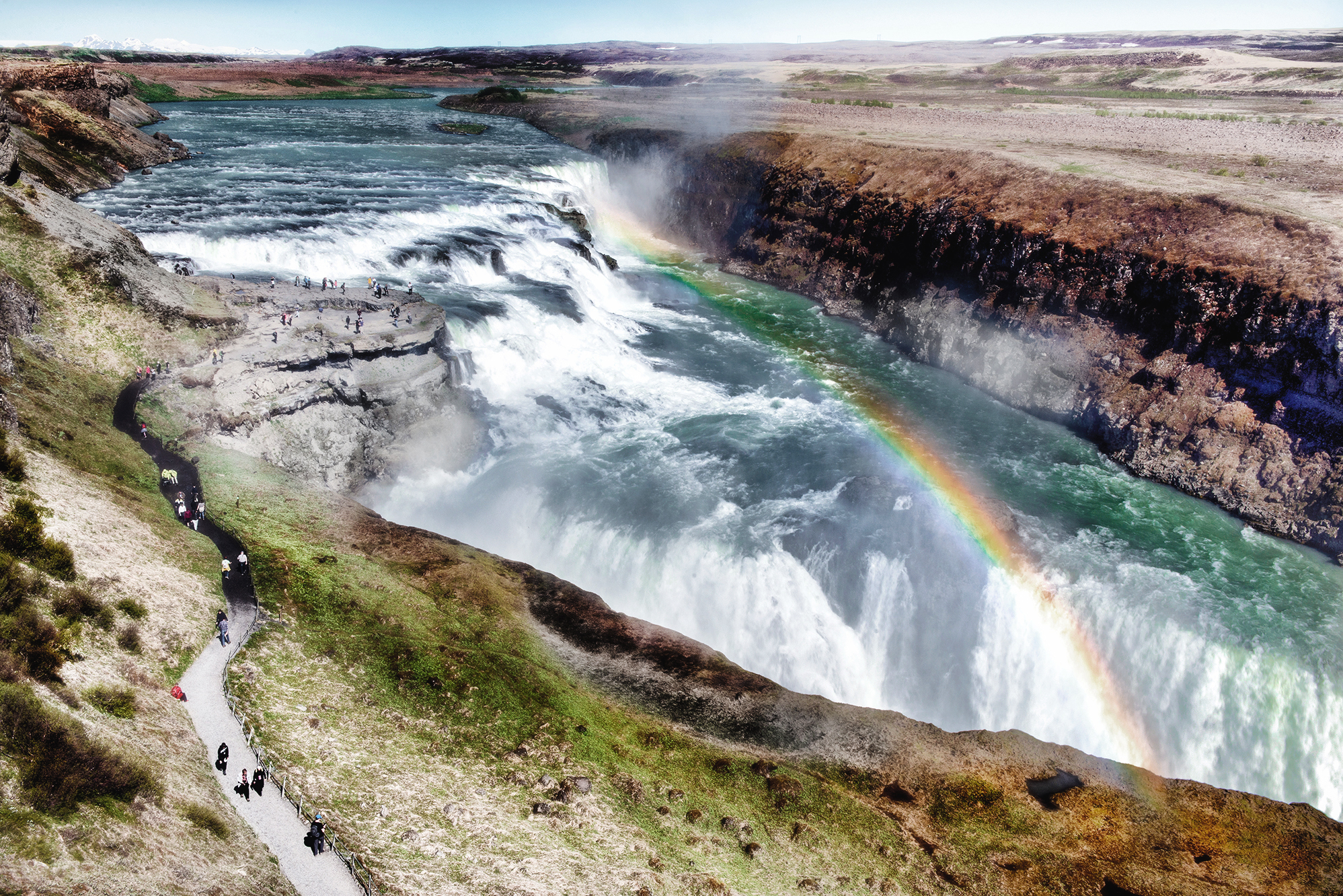 A tan solo 10 km de allí también se puede sentir, incluso con más intensidad, la fuerza del agua. La cascada Gulfoss es una de las más llamativas y sorprendentes de Islandia gracias a su cascada doble de 32 metros de altura y a una anchura de 20 metros. Gullfoss es famosa no solo por su impresionante potencia, sino también por los arcoíris que se forman en su vapor en los días soleados, un elemento más que sumar a una vista ya de por sí increíble.