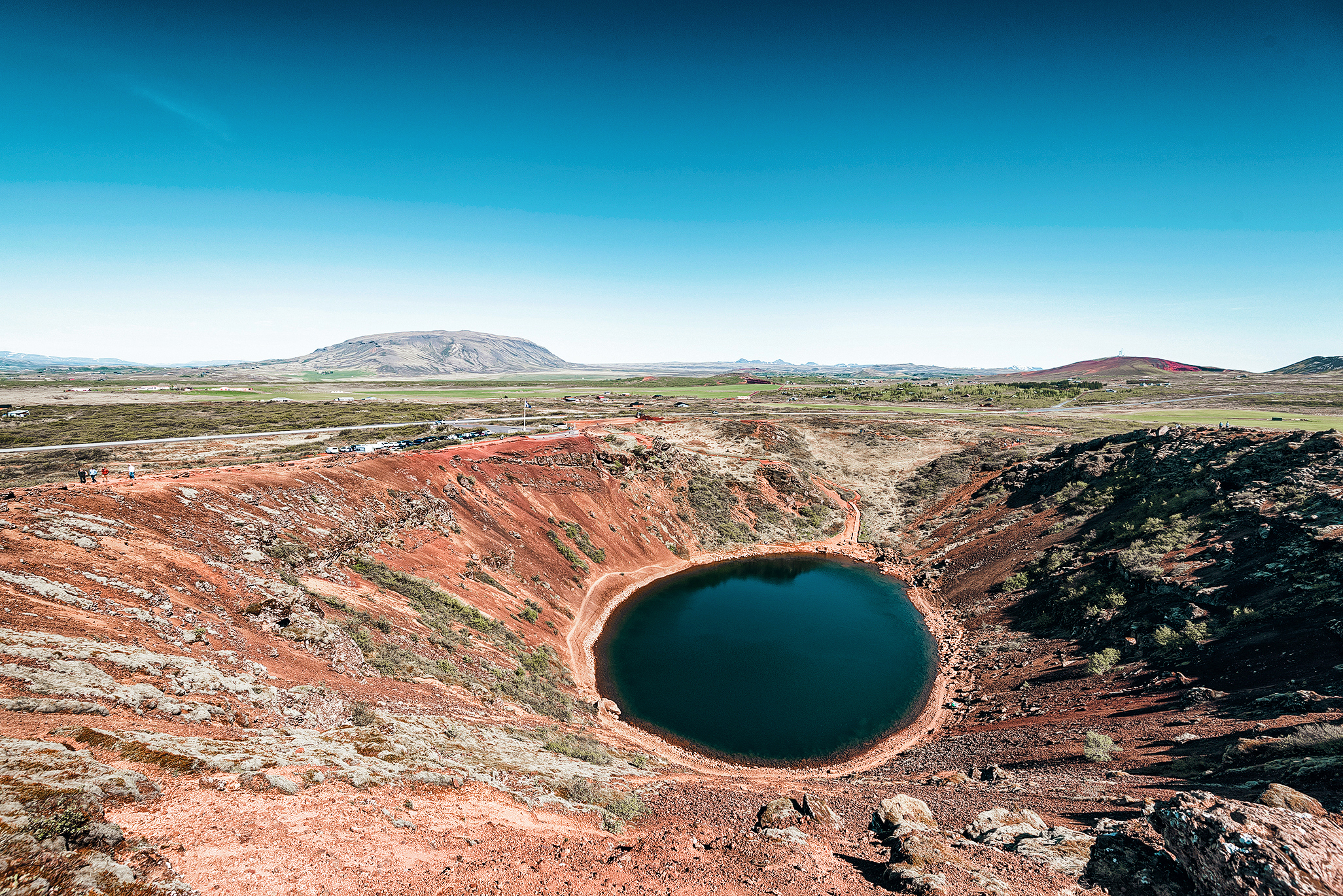 Partiendo desde Reykjavik, nuestra primera parada es el cráter Kered. Aunque originalmente se pensó que se había formado por una gran erupción, los estudios más recientes confirman que se trataba de un volcán cónico que erupcionó y vació toda la reserva de magma, de forma que el cono colapsó sobre sí mismo. El agua que se ve en su interior está al mismo nivel que el mar y no proviene de la lluvia. Podemos rodear el cráter a pie y después bajar hasta el agua para hacernos a la idea del tamaño del volcán.