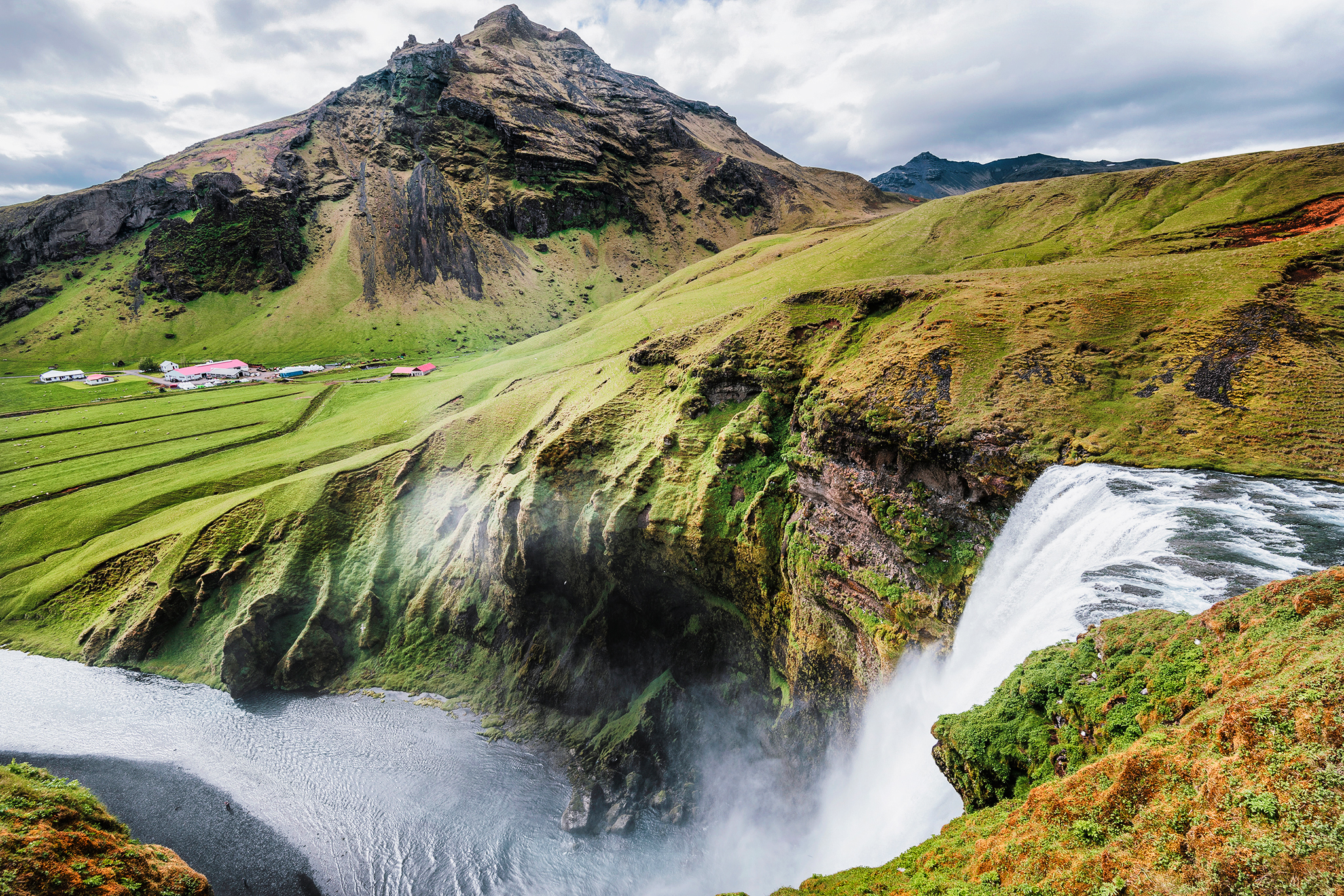 Donde también nos mojaremos, si nos acercamos demasiado, es en la cercana Skógafoss, ubicada en el río Skógá. Claramente visible desde la carretera es una de las más grandes de Islandia, con un ancho de 25 metros y una caída de 60 metros. Skógafoss también puede verse desde arriba, ya que una empinada y larguísima escalera conduce a una plataforma de observación, aunque tenemos que estar preparados ya que la subida equivale a unos 20 pisos de altura.