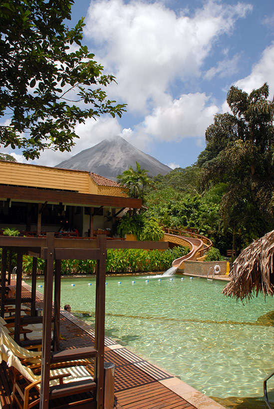 Parece imposible que la reconocida silueta del volcán Arenal haya llegado a mantenerse casi intacta tras tanta actividad como la que presenta este volcán. A pesar de su alto grado de actividad, el Arenal sigue atrayendo al viajero más intrépido que deseoso de ver un volcán en pleno apogeo acude a su Parque Nacional a cumplir su anhelo. Y vaya si se cumple. Lo cierto es que la zona de La Fortuna y el Volcán Arenal es la zona más conocida en Costa Rica para bañarse en aguas termales, especialmente al anochecer. Las aguas naturales que emanan de las entrañas del volcán tienen propiedades beneficiosas para la salud: mejoran el sistema inmunológico, regulan las funciones glandulares, aumentan la producción de endorfinas y, por supuesto, relajan cuerpo y mente.